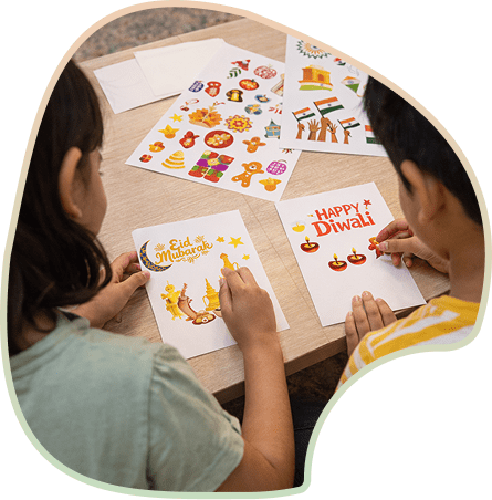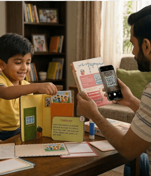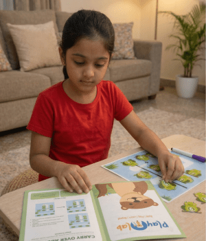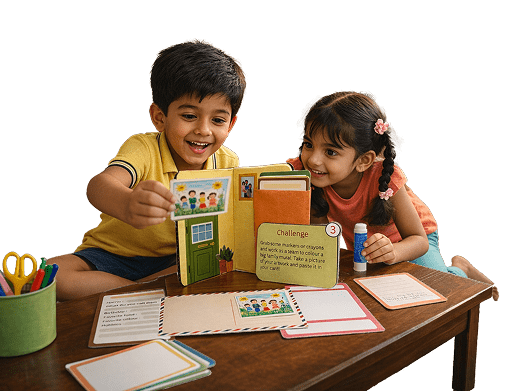 Through games and challenges, children build foundational skills in Math, EVS, and English while engaging parents in meaningful, low-screen exploration.
